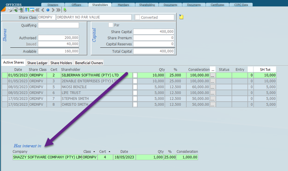 Its important to see who the actual shareholders are by share certificate. The screen below gives this. If a share certifcate is clicked on then the shares held by that entity or individuals are shown below.