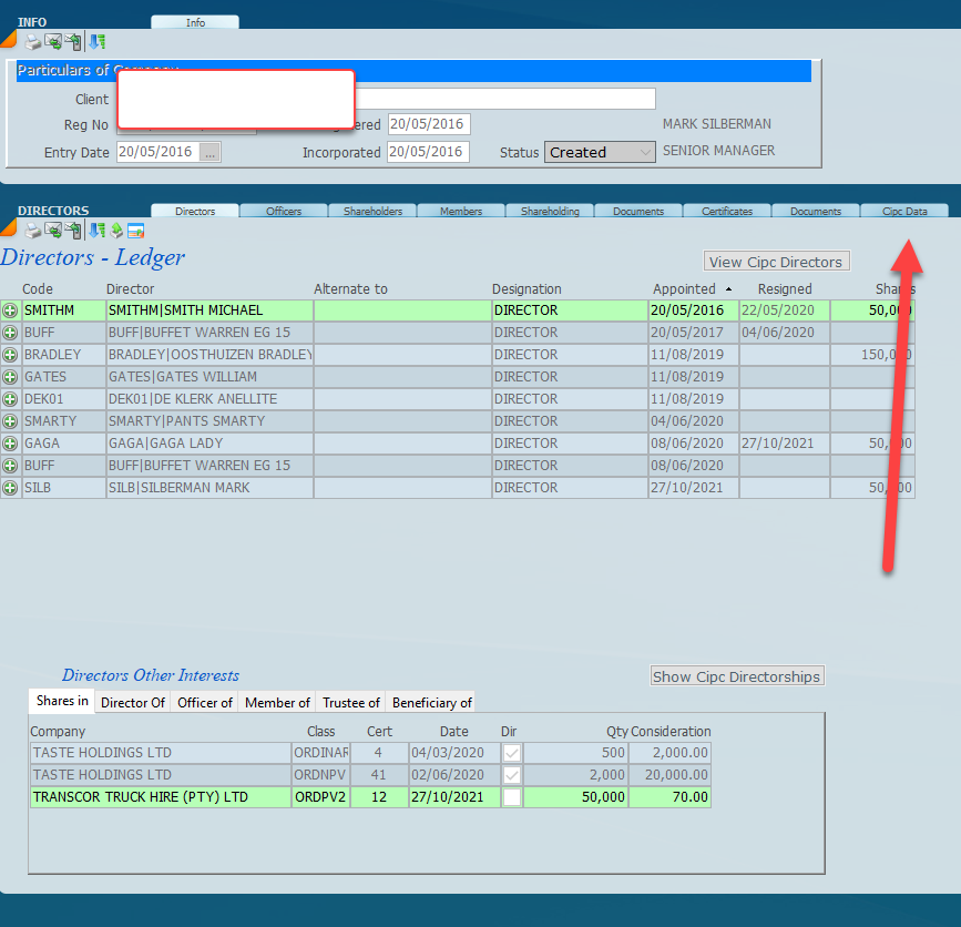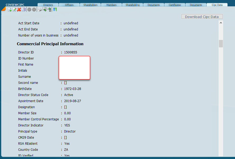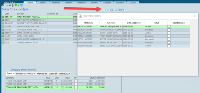On the directors tab after the download has taken place click on the View CIPC Directors and the directors connected window will open showing will show all the directors in that particular company.