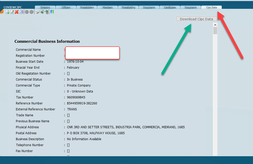 Click the Download CIPC Data on the screen below and if the company name and registration number is valid the data will come down as shown below. To see all the data scroll down.