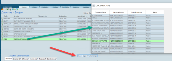 In order to see all the companies connected to an individual director click the director you want and then click on Show CIPC Directors and a box will open showing all the companies that are linked to the director highlighted.