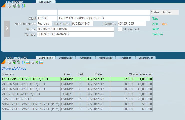 In case of of a company the shareholder details will be obtained by entering the code in the blank screen to obtain all the shareholdings. For an indiviuals enquiry click here. Individual Enquiry.