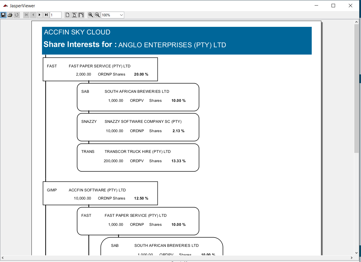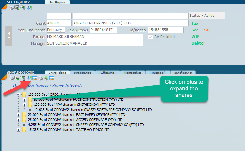 Switch view to obtain direct and indirect view of shares. Click on the plus signs to drill down to the company in which the shares are held.