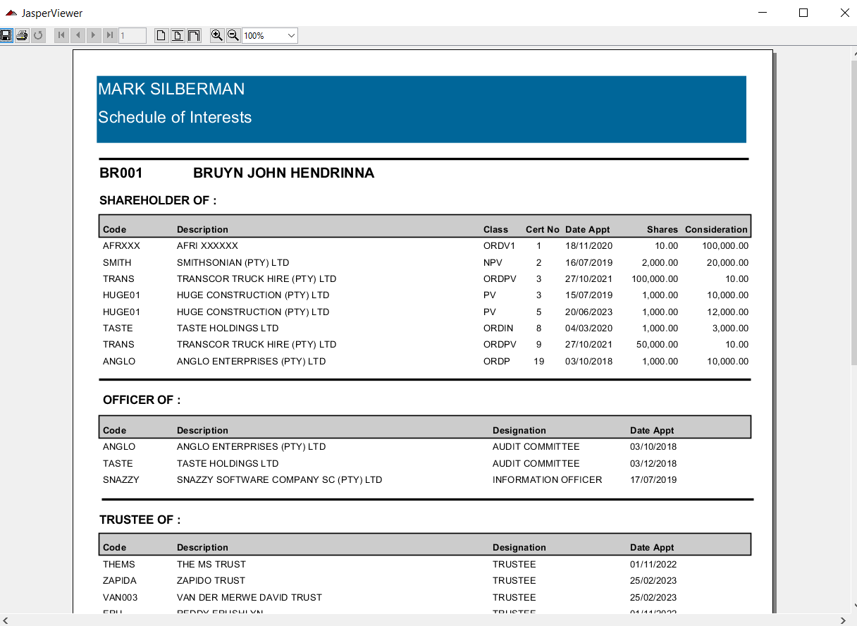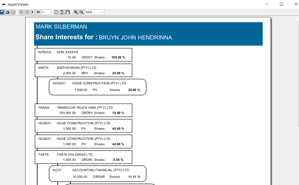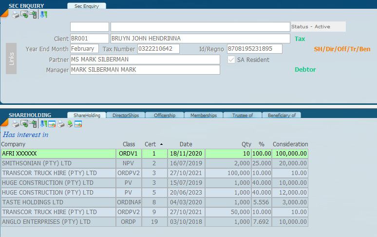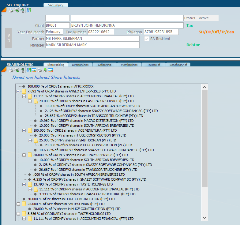 Switch view to obtain direct and indirect view of shares held by the individual, in other words what the individual holds. Click on the plus signs to drill down to the company in which the shares are held.