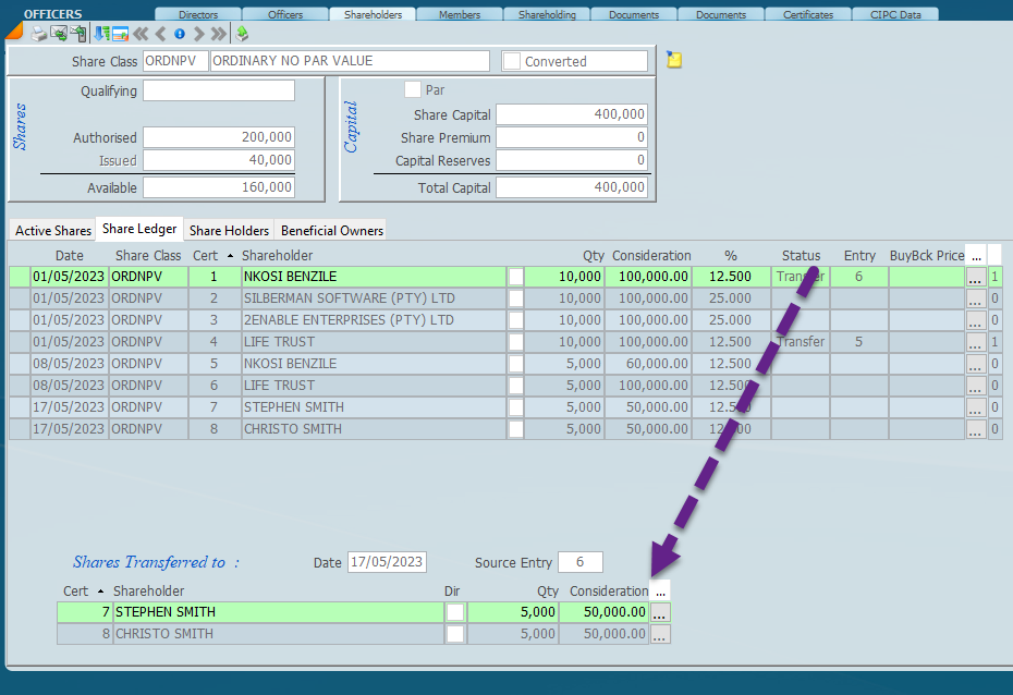 This screen showns the actual shareholders are by share certificate and all the movements by share transfer and conversions. The screen below gives this. If a share certifcate is clicked on then the shares held by that entity or individuals are shown below.
