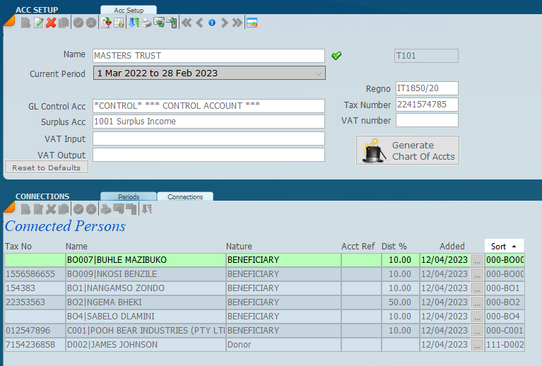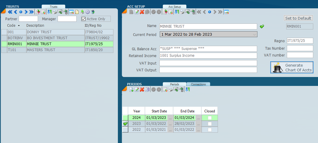 This is where the Trust Administration screen is set up. Enter the various inputs starting with the Chart of Accounts and then setting up the period as indicated on the screen below under the Periods tab. Each financial period must reflect the transactions for that year which in turn will generate a final trial balance allowing IT3-T to be uploaded and the tax return to be populated.