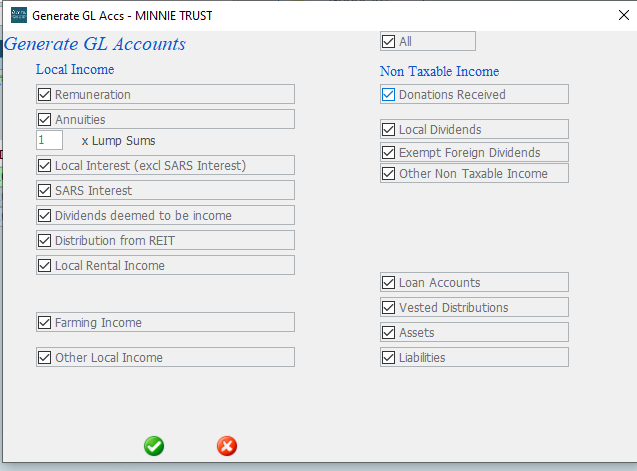 By ticking the green tick the system will generate the chart of accounts including the groups as selected. By ticking All the full chart of accounts will be generated.