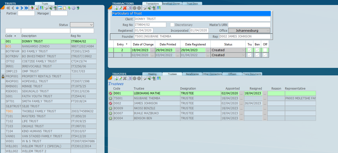 Just below that you have got all the transactions that have been done against this trust client starting from 1 at the bottom to 2 at the top, and by clicking the little down arrow next to Entry the order can be reversed. The transaction are on the tabs on the bottom right hand side and by selecting the various tabs you can do different kinds of transactions or see the history of a transaction.