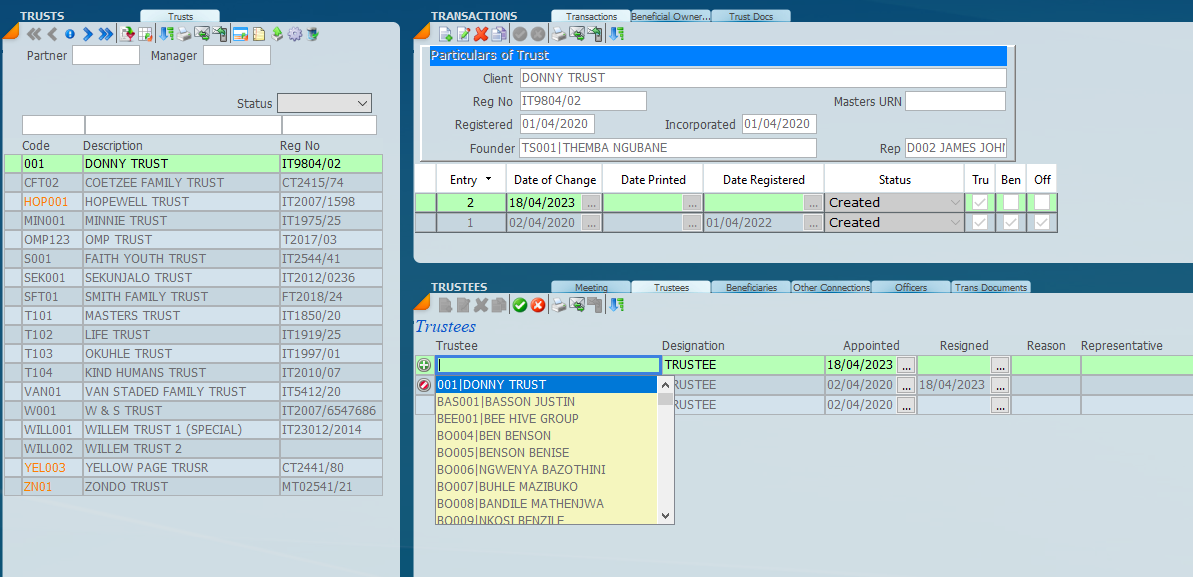 To appoint a Trustee select the Trust tab and select the new button and the following screen with the drop down box indicating individuals you can select as a trustee. Navigate to the individual you want and by clicking on it the individual will be added to the grid as a trustee.