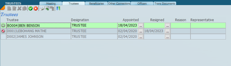 Once you have selected the trustee you want click on the green save tick and the Trustees will display as below;
