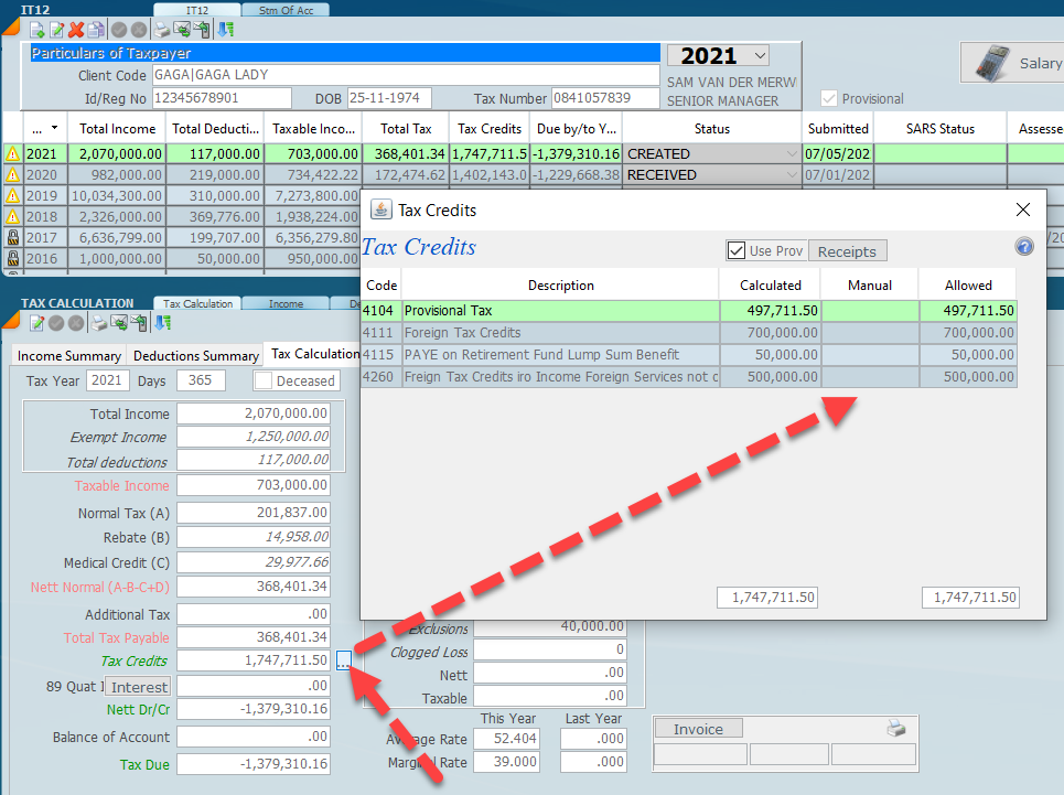 Click on the 3 dots to open up tax credits. The provisional tax and PAYE calculated or entered on the system will appear here. The figures may be overided by entering in the manual column.