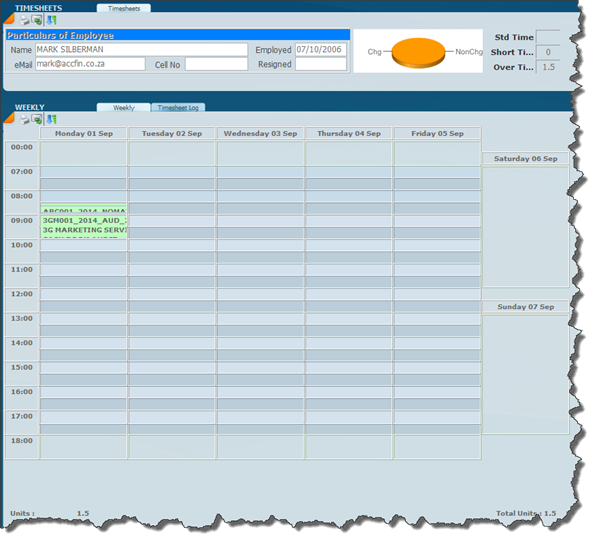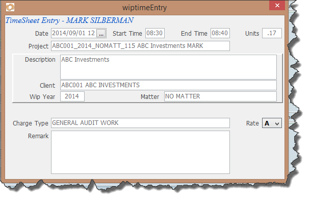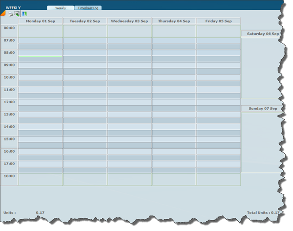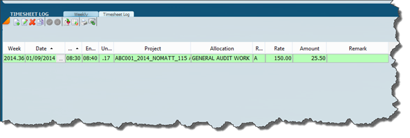 Note that the units is calculated at .17 of 1 hour being 10/60. In the screen below the graphical representation of the time slot is shown on the time sheet. It shows as a very thin line on the time sheet.