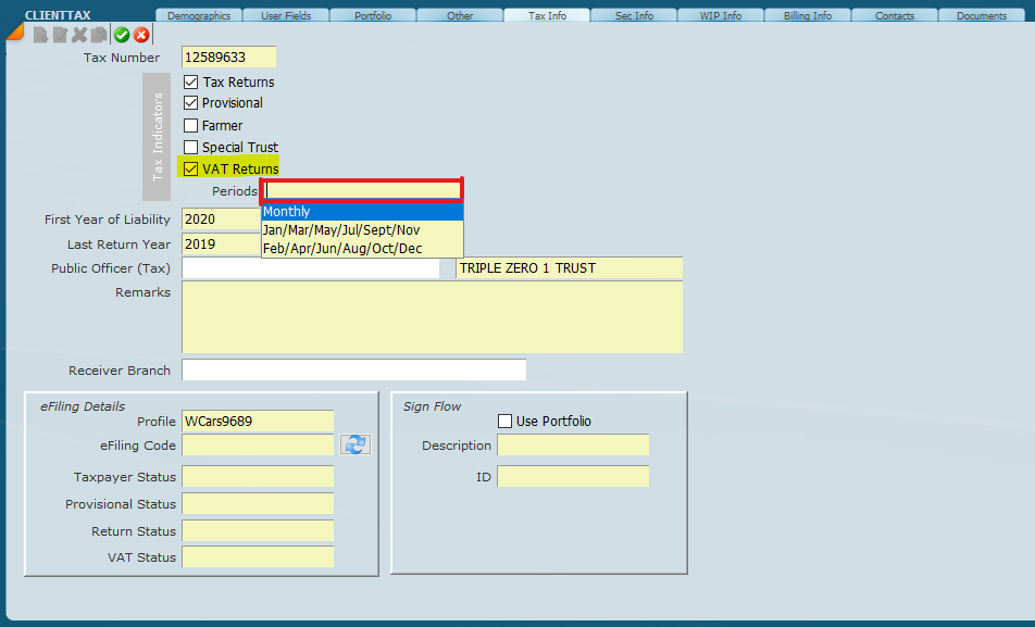1. The first step for VAT returns is to go to Masters>>Clients screen and on the Tax Info tab tick VAT Returns and setup what Periods should be for submission