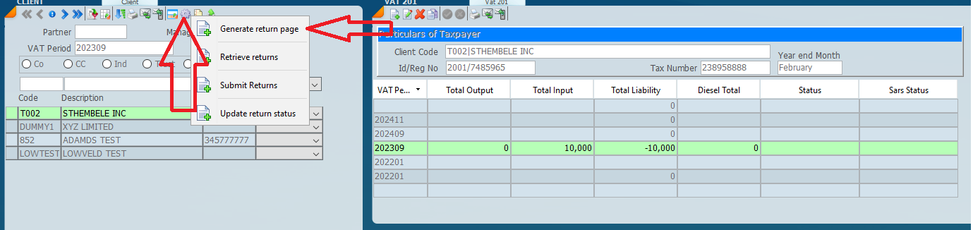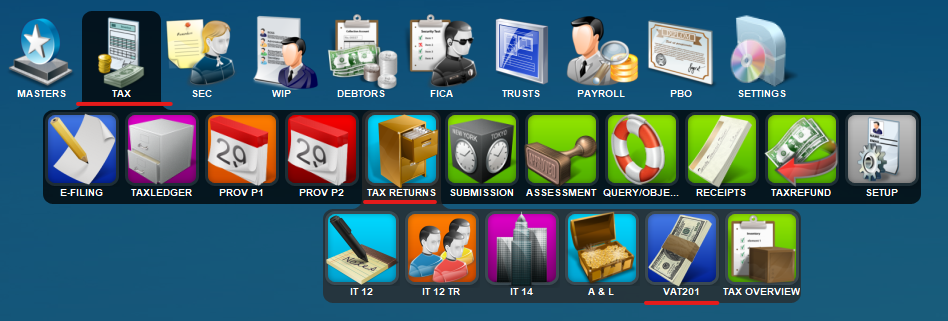 2. The you will move to the VAT 201 screen by going to Tax>>Tax Returns>>VAT201.