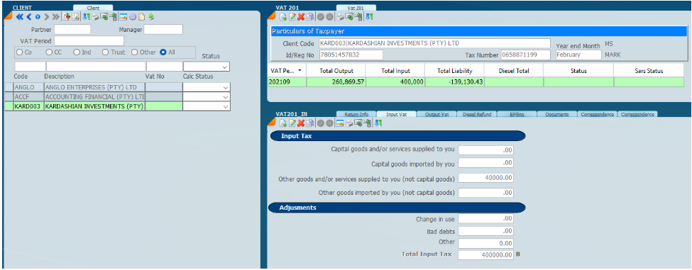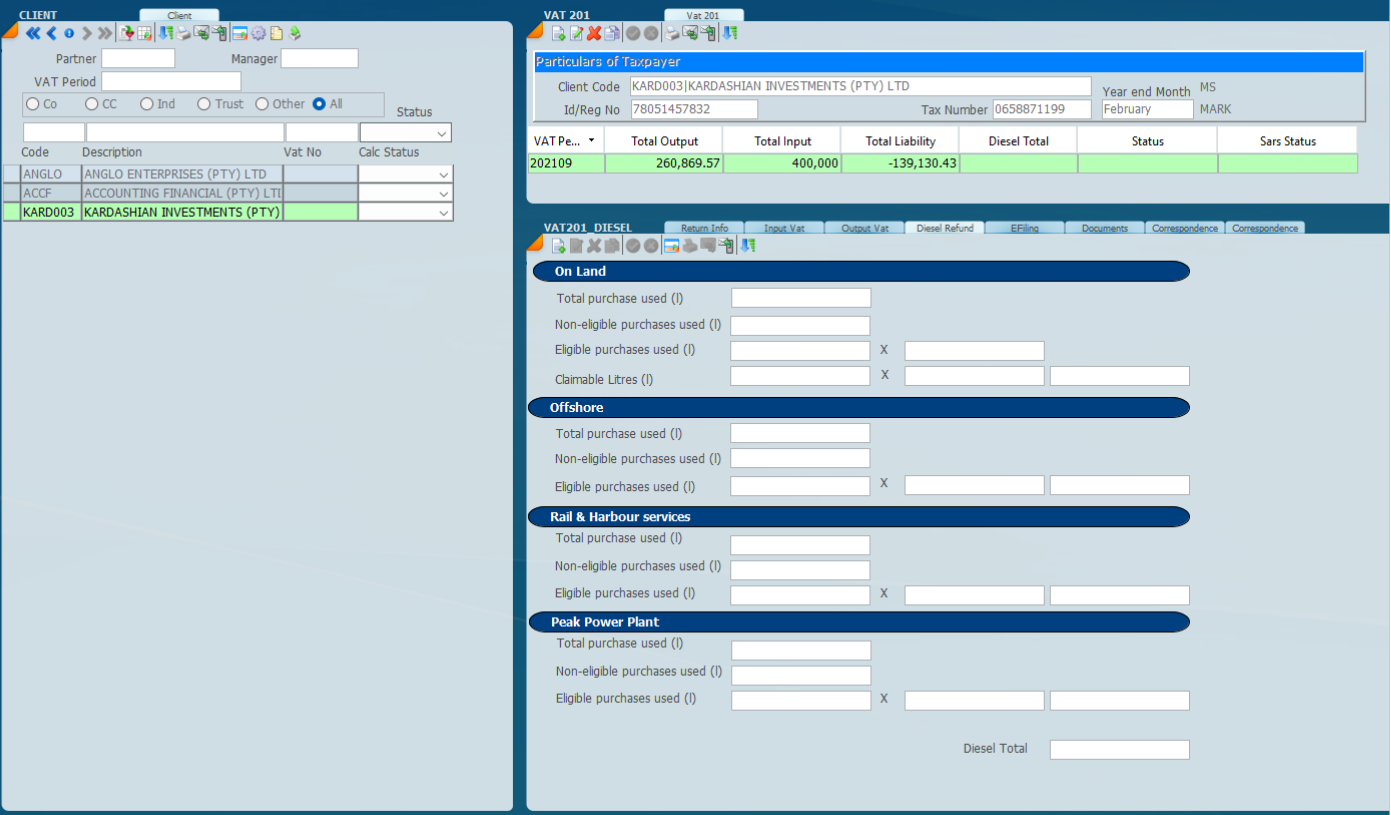 In order to create a record you need to click on the new icon on the top , and then enter the total purchase used and the non-eligible purchases used per each section they apply to. The rates at which these will be multiplied will pre-populate onto the return when you retrieve from SARS.