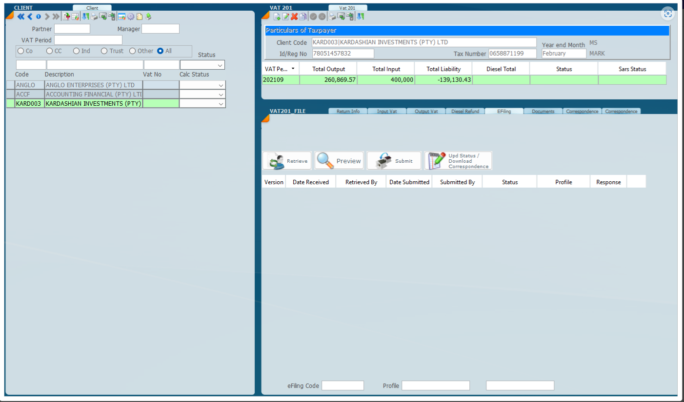 By selecting the efiling tab the following screen will display and you can drive the whole eFiling process from this screen.