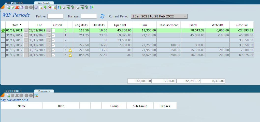 WIP periods are where the period is set. The current period is where all the transactions will take place. The green tick indicates which period you are in.