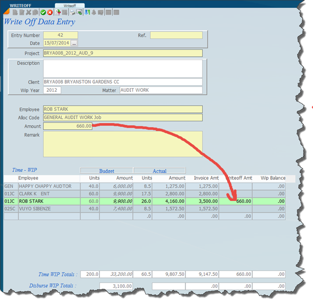 The above screen has been created with the necessary data being entered into the yellow area. Click on the employee you want The end result of the transaction is that the balance of R660 against Rob Stark has been written.