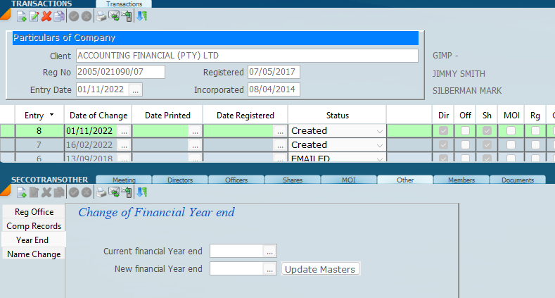 This screen allows the change of the year end. Once accepted by SARS and the CIPC update the master file.