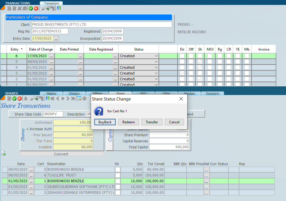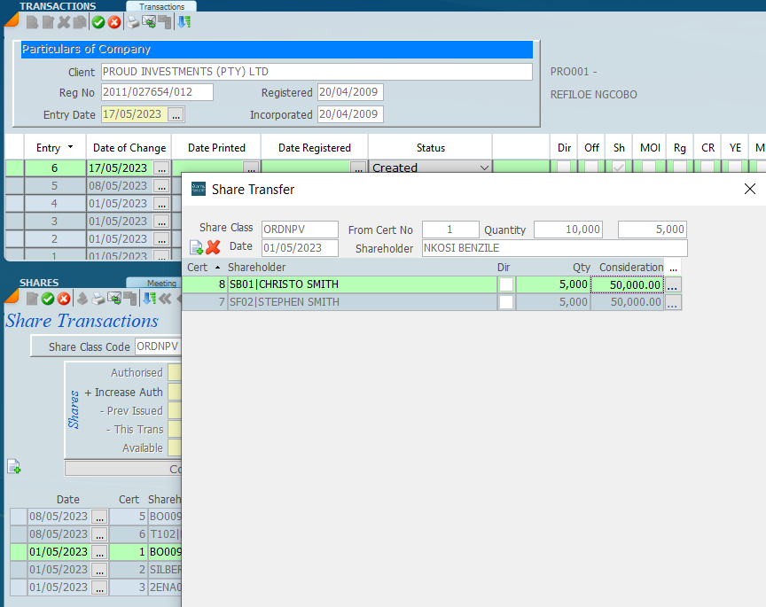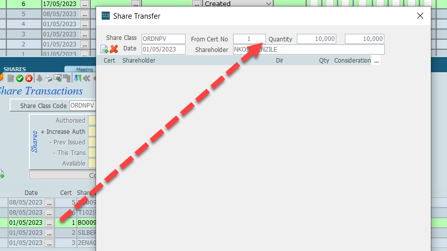 Click on transfer and the following box will open. Click on and then allocate the new share certificate to a shareholder in the client file.