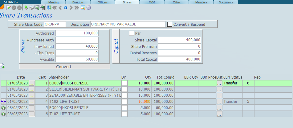 Close the box and the share screen will look like the screen below. Note the next to the new shareholder and the next to the share that has been transferred.
