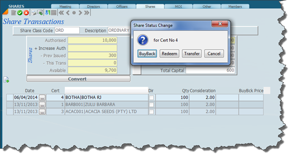 The screen below shows the two share certificates 2 and 3 and you will see the left of the share certificate number 2 there is a little red icon, this means that it has been bought back. We would normally click on this area and then we would indicate the buy-back price. After we have done this we have clicked on the capital button which will be to the left of the brown share capital adjustment screen and you will see that we bought back 500 share certificates at R2 per share giving the total price of R1,000. The share capital, the share capital above reflects an adjustment, a payback of R500 to share capital and R500 to share premium, leaving the balance of R500 each with a total of R1,000.