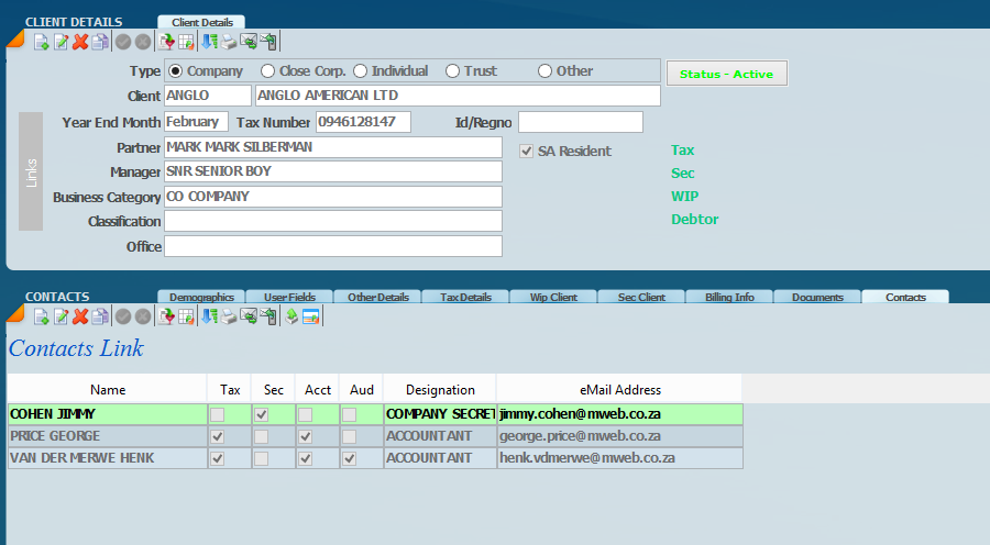 Note how we can indicate from an e-mail in Point Of View, which of the contacts need to receive the e-mail. For example: Jimmy Cohen will get all the Company Secretarial e-mails and George Price will get all the tax e-mails as well as anything related to the accounts and Henk van der Merwe will get Tax, Accounts and Auditing information.
