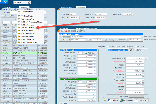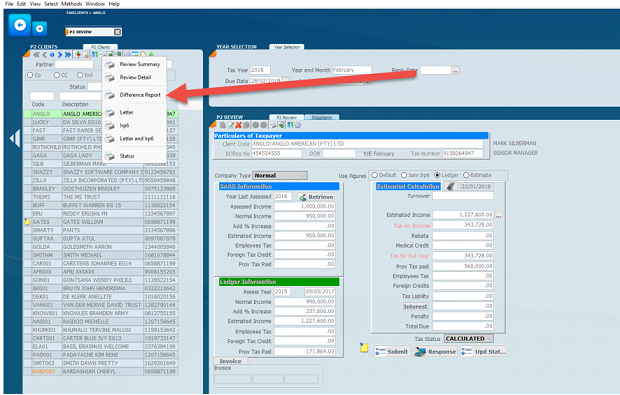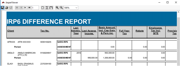 There is a method to automatically determine the difference between what SARS has on the income on the e-filing website that is downloaded into the Sky system and what your ledger figure is. This is done by setting the difference filter (standard filter see below) which will display all those provisional tax records that have a difference or just produce the difference report.