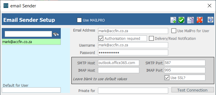 Complete the email screen below with the help of your IT department or Accfin Support.