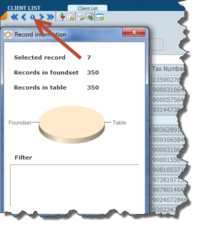In the screen above record 7 has been selected and there are 350 records in the table and all 350 are shown as their is no filter set. Where you set a filter the number of records in the foundset will reduce.