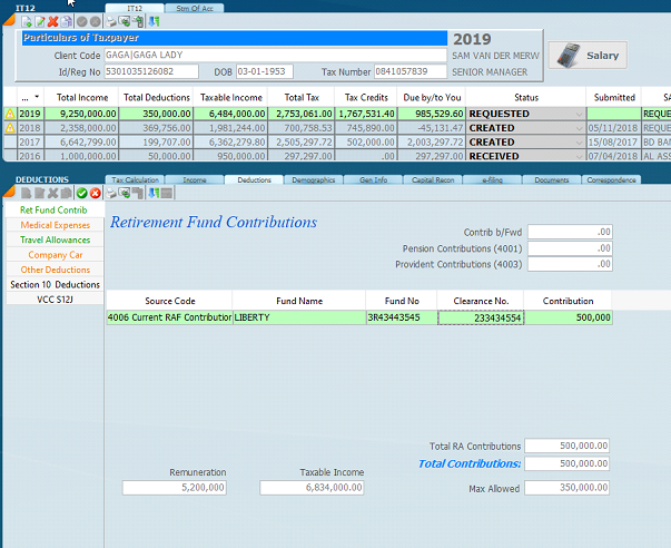 It’s important to understand exactly how the retirement funding contributions work for the tax year 2018. The different types of contributions being retirement annuity, pension and provident were brought together in 2018 and are now treated as one total calculation of contributions. The screen below depicts the deduction contribution screen for the 2019 year.