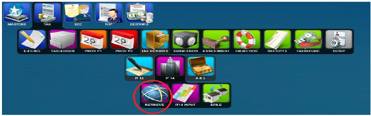 · Click on the Tax module, then select>>>>Tax Returns>>>>IT14>>>>Retrieve