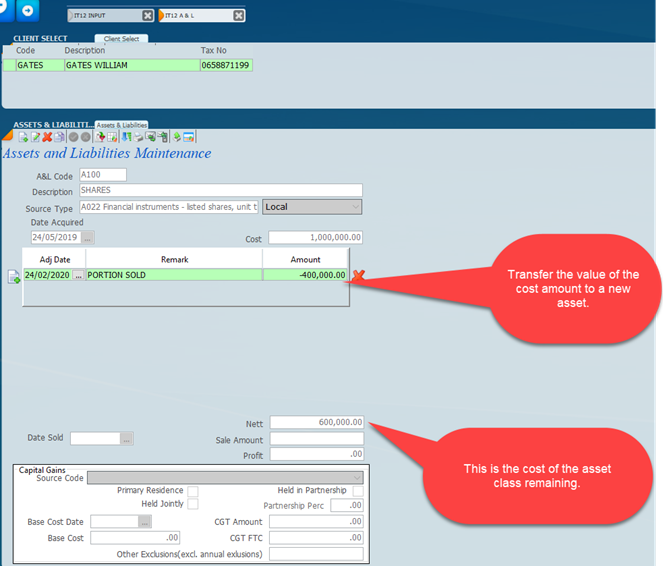 In the above screen the portfolio has been reduced by R400,000 and we create a new asset at a cost of R400,000 and the asset portfolio left over remains at R600,000.