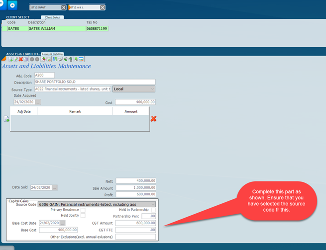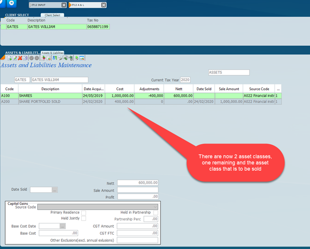 The screen below shows the sale of the assets of R400,000 for R1,000,000 making a profit of R600,000. Enter the sale details and the base cost as shown below.