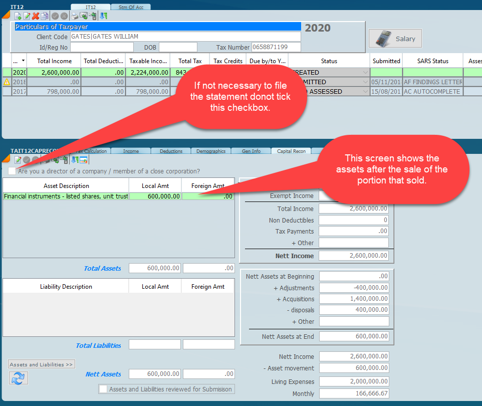 The asset screen below shows the assets remaining after the sale with the amount of the R400 000 having being sold.