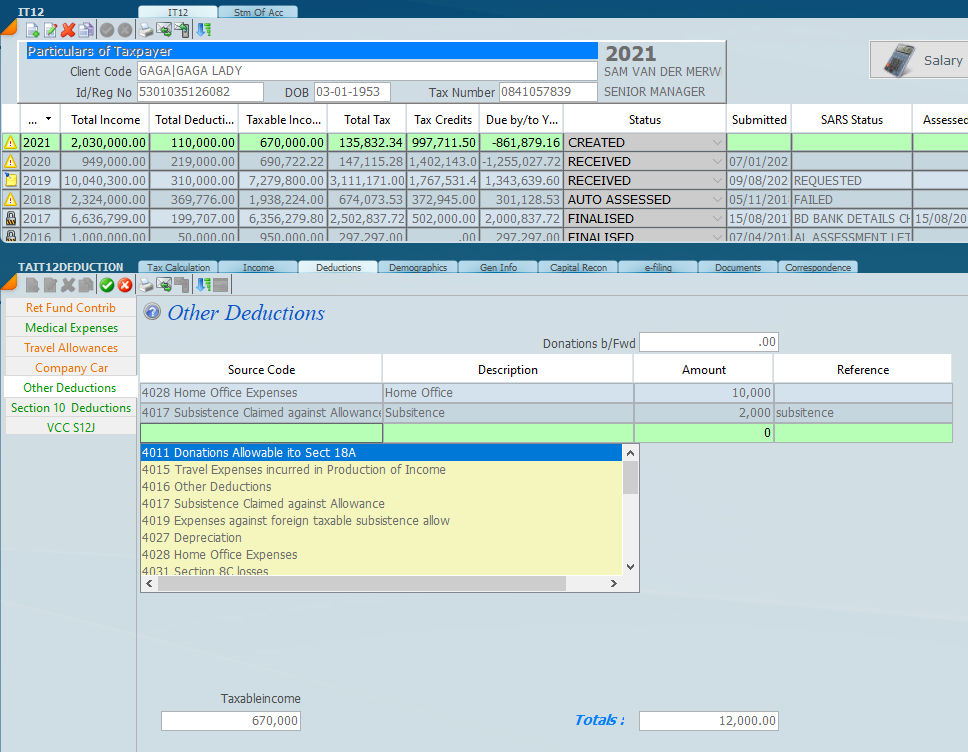 The screen below depicts a summary of all the deductions when you click on the deductions tab.