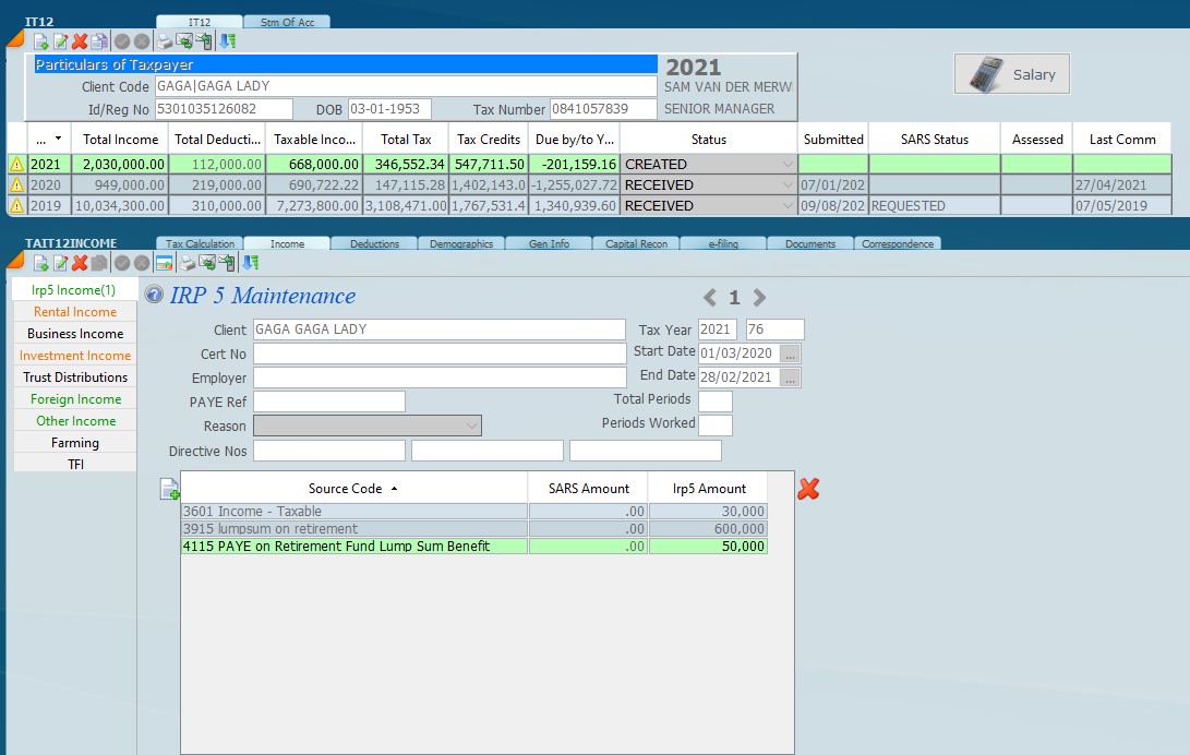 When you click on the income tab the following screen will display. The screen below has the IRP5 button highlighted and this will show the inputs for the various IRP 5's, you can have multiple IRP 5’s and using the arrow heads on the top right of the screen below you can scroll between them.