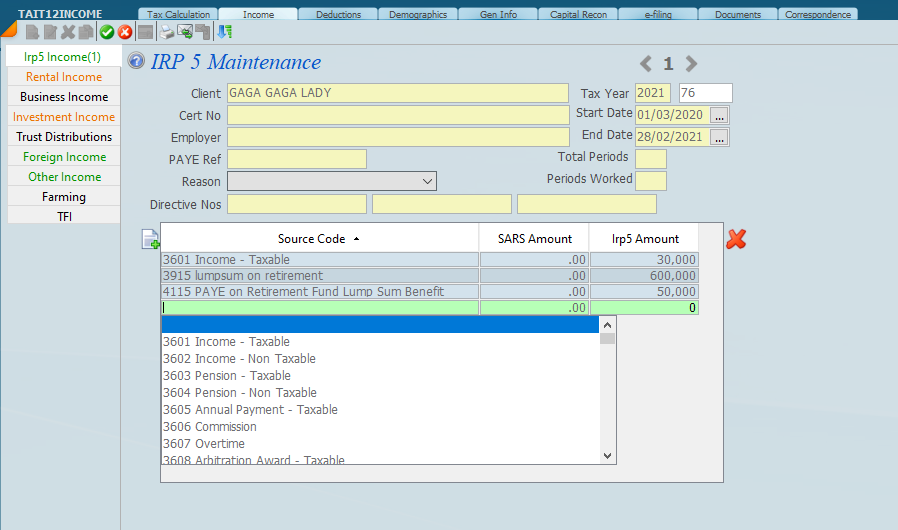 When you have put the screen into edit mode and you wish to enter a source code it is simply a matter of clicking on the source code and then you will get a list of source codes that are in the system as in the screen below. You can scroll down to the one that you require and click on it. The same principle would apply if you are in add mode that is when you want to create a new line item of source codes. The screen below depicts what the screen will look like if you are adding source codes. One would only add an IRP5 in the event that the taxpayers IRP5 has not been retrieved from SARS and you would edit a source code if it is wrong.