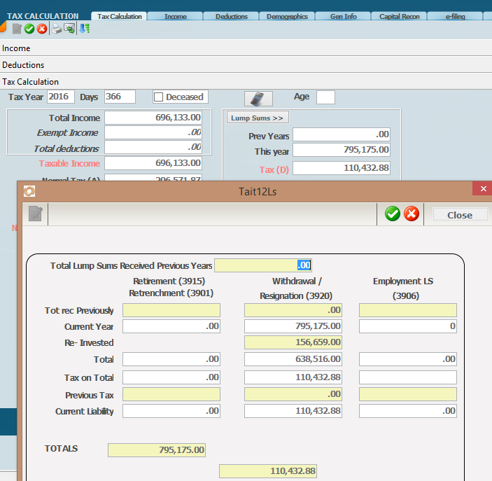 It is very important to know that in all instances there is a directive issued by SARS where there are adjustments to the Retirement or the lump sum payment. In this instance it is very important that the adjustment is made on Sky Tax on the screen below as the system does not get this on retrieve of the tax return. In the example below there is an amount of R795175 being the amount paid out and SARS have made an adjustment of R156659 for reinvestment. Please note where this has been entered (under Re-Invested) this will affect the calculation of tax on the lump sum.