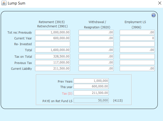 The first indication that there is a lump sum is where you retrieve the tax return from SARS and there is an IRP5 with PAYE deducted. The system will give you a warning sign when it detects a lump sum to check the past. As a rule taxpayer clients forget about lump sum withdrawn in the past. The data on lump sums may only come down as an IRP5 but there is nothing to tell you that a lump sum was paid out years ago. If you don't fill in the screen below your tax calculation will be wrong as compared to the SARS calculation and assessment.