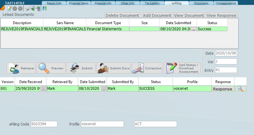 By selecting the efiling tab the following screen will display and you can drive the whole eFiling process from this screen. Please note that an ITR14 cannot be filed unless the return has been retrieved from SARS.