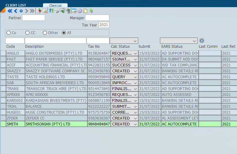 You may use filters in the left hand panel to only display a selected group of taxpayers. You may use Partner and Manager filters and you may select a group of clients based on the ledger status. You may also, If you are running a practice with multiple profiles make sure that you have got the correct profile against each taxpayer. If you are going to work in bulk, work with one SARS profile at a time.