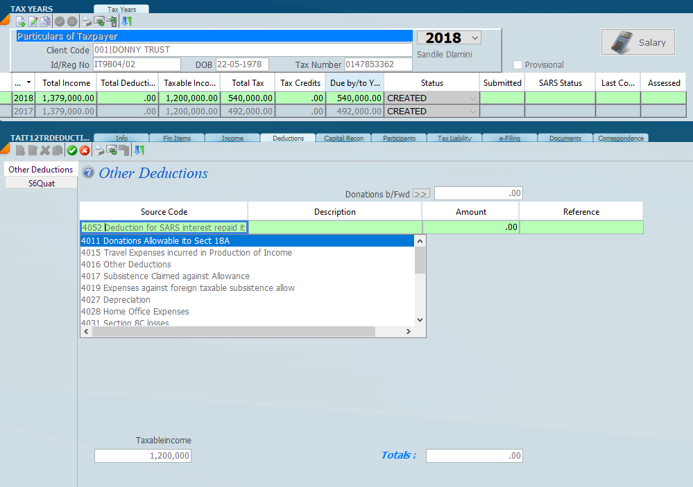 Enter the trust deductions on the screen below. By clicking on the source code area there is a list of source codes that can be used.