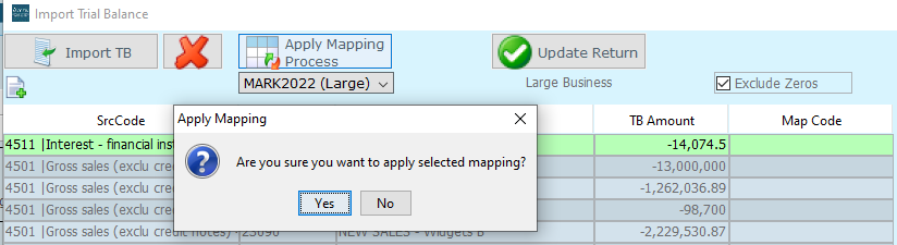 Where the TB has been retrieved without source codes and you have mapped the accounts code to a file in a previous year select the name below and click on Apply Mapping Process and the mapping contained in that file will insert the source codes. In this case the file is called MARK2022.