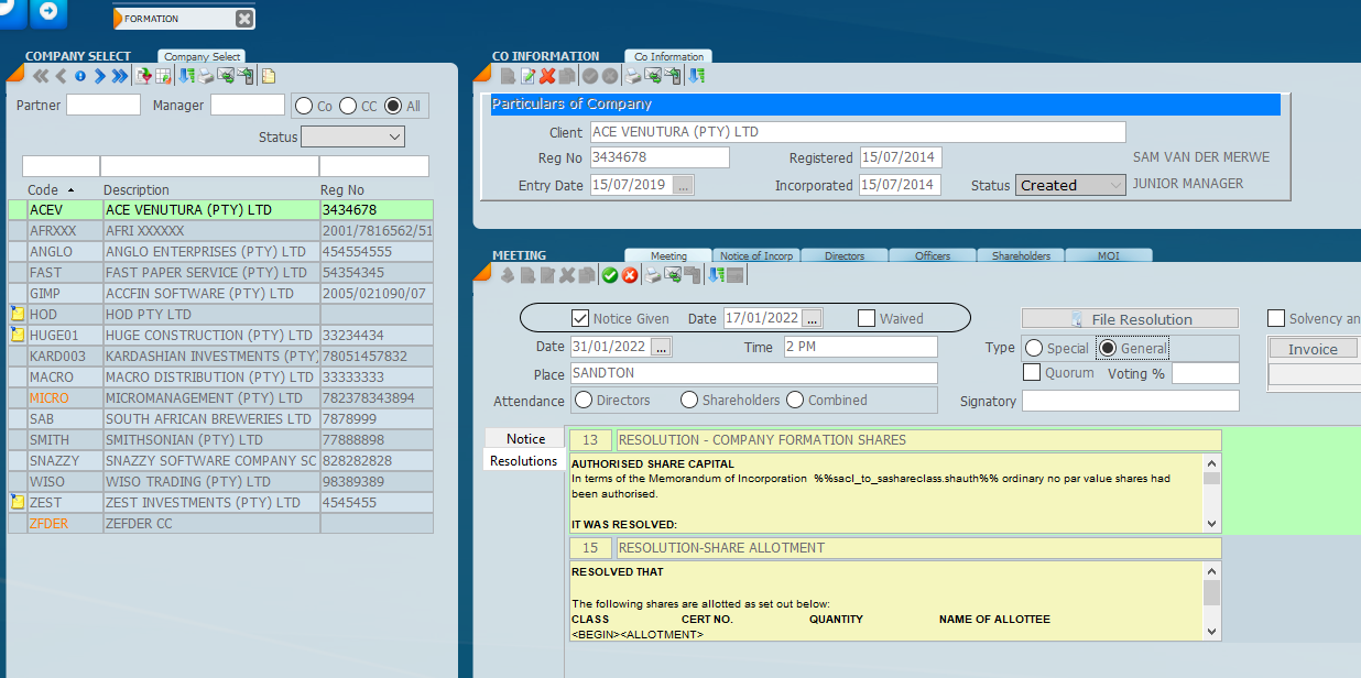 It is also important to note that the meeting tabs works with other parts of transactions, for example if you change an MOI or appoint or resign a director you can use the meeting tab to specify what kind of meeting it is, the dates of notice etc and produce minutes and resolutions.