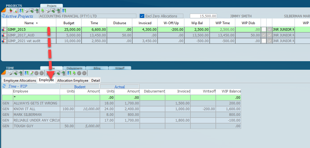 After the invoice has been processed the project enquiry screen will appear as below. Notice that the invoices that have been billed reduce the wip balances for each employee.
