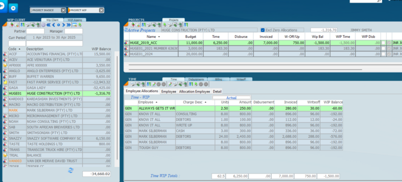 In the above screen you will see the wip balance for each employee. This screen should be used by the partner or the manager when it comes to the determination of the amounts to be invoiced.