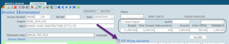 Generate a global invoice by WIP line by clicking on open WIP allocation