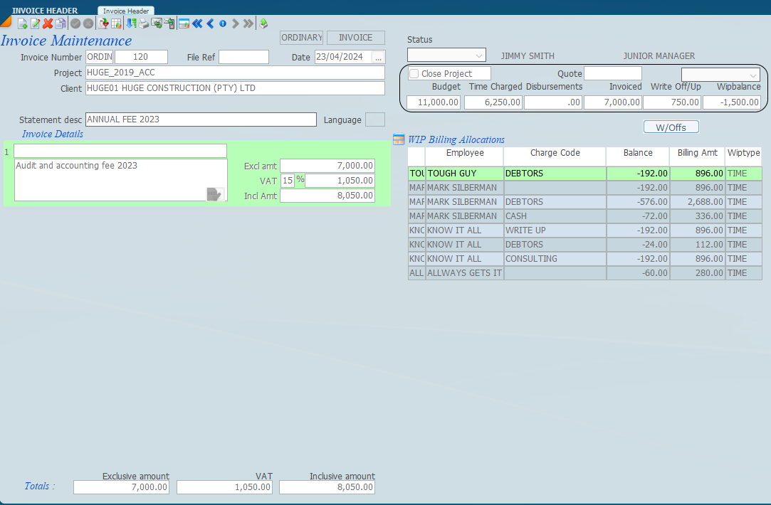 Enter the global amount you want to invoice on the top and enter the write up or write off - the R7000 and the R750 where indicated by the purple arrow.