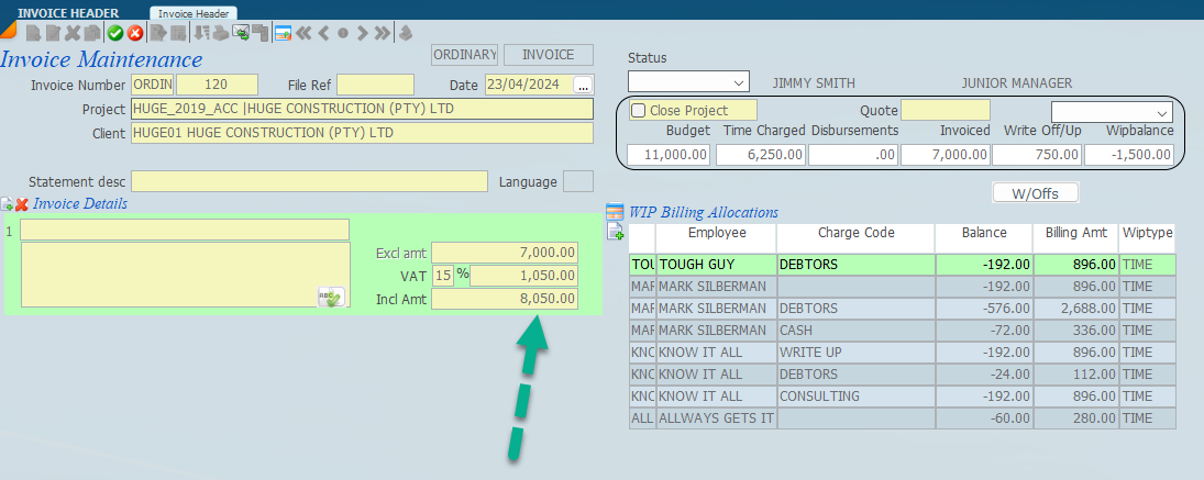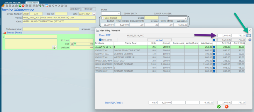 Enter the global amount you want to invoice and enter the write up or write off - the R7000 and the R750 where indicated by the purple arrow.