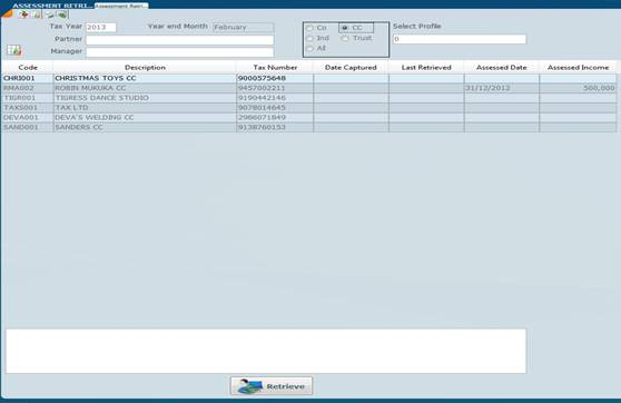 By clicking on the assessment icon and then the retrieve assessment assessment will download and the following screen will display. The assessments can automatically be retrieved from the e-Filing system and the record or the amounts that you see on the right hand side on the screen below will automatically be updated by the system.